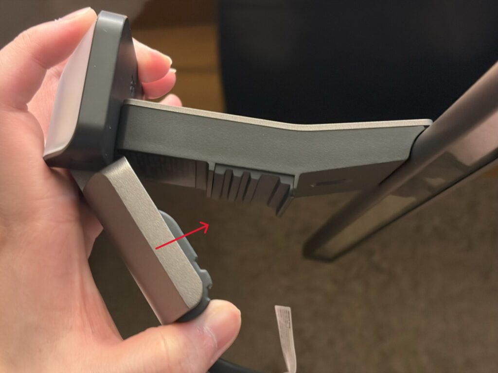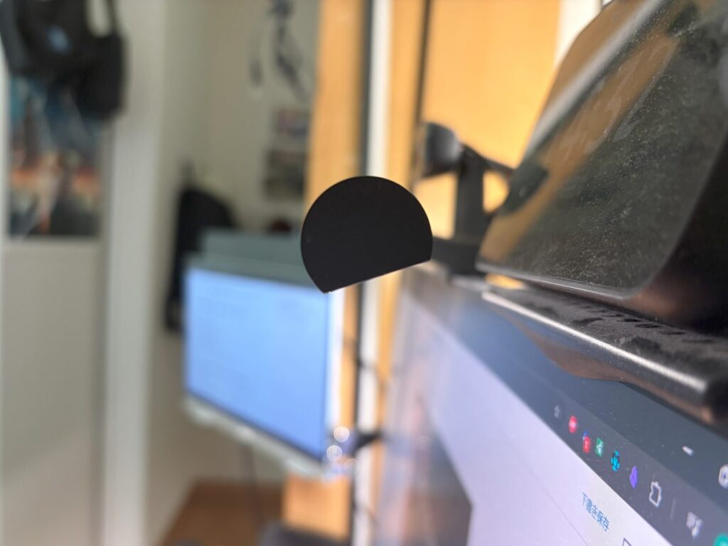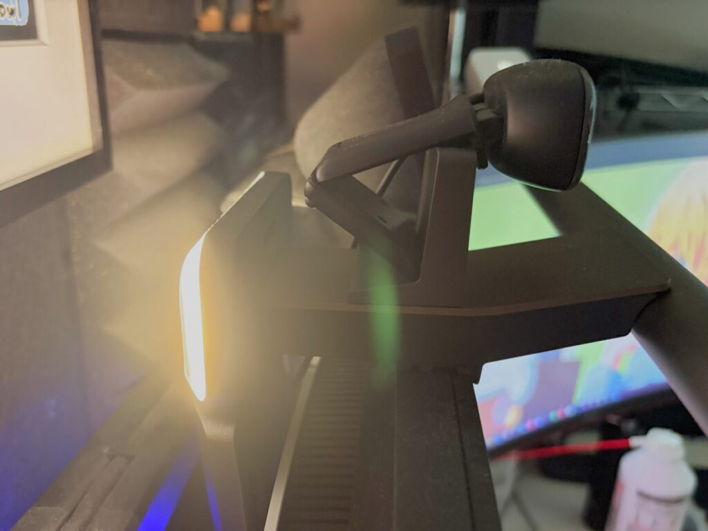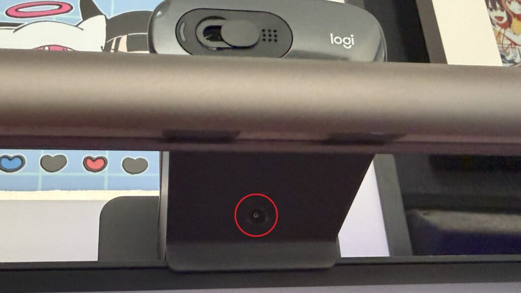 画像のような感じでWebカメラを取り付けられます。モニター上に付けるタイプのライトはWebカメラと干渉することが多いので、地味に助かる仕組みだなと感じました。