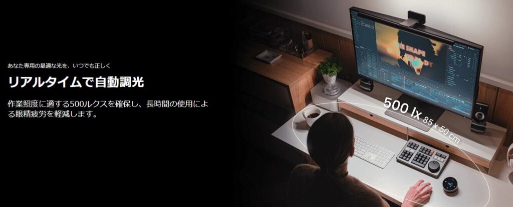 明るさについては、特にモニター側は100%だとかなり明るいです。普段50%で使用していますが、体感他のモニターライトの70%くらいの明るさがあります。